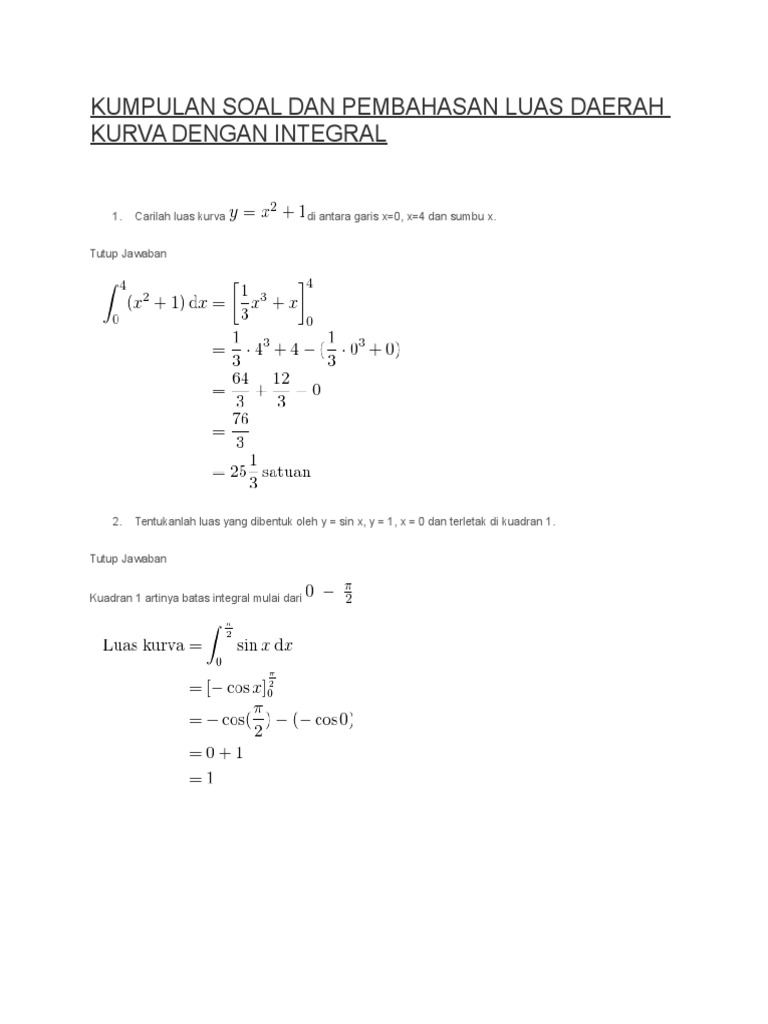 Contoh Soal Integral Untuk Menghitung Luas Daerah. Salah satu aplikasi integral tak tentu adalah untuk menghitung luas. Untuk menghitung luas ini kita harus memahami apakah daerah yang dimaksud berada di atas kurva, di bawah kurva, di Maka luas daerah di atas bisa dinyatakan dengan.